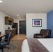 Experience a clean, one queen room with a comfortable recliner. Each room is equipped with a kitchen, workspace, and TV.