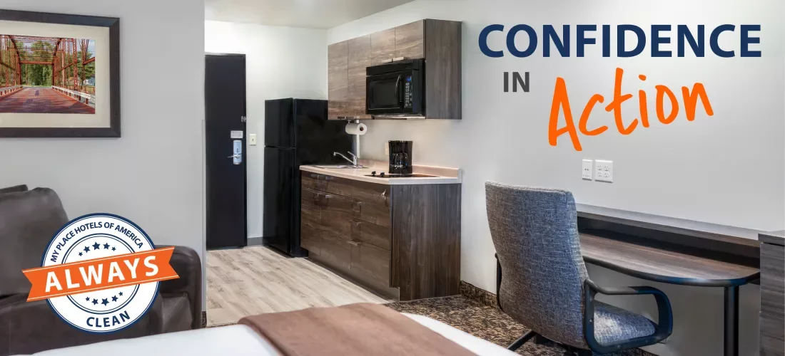 The moment you walk through the sliding doors of a My Place Hotel, you can guarantee that you will be greeted by a smiling, friendly face eager to check you in, offer you the ability to Stay Rewarded, and guide you through your stay. You’ll feel like a member of the My Place Family before you’ve even received your room key. And, should you need any help for the rest of your stay, our hotel staff will be there to help you in a moment’s notice.